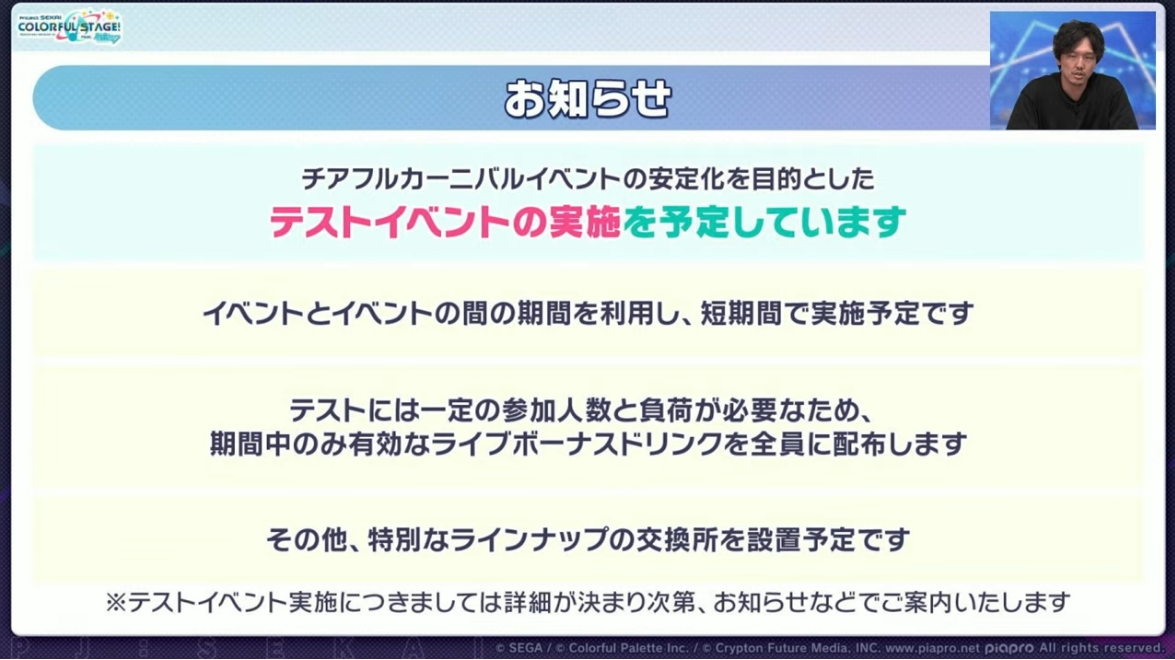 そういえばチアフルライブを中止する代わりに「イベントとイベントの間でテストイベントを開催する」みたいことを言ってたけど、この話どうなったの?